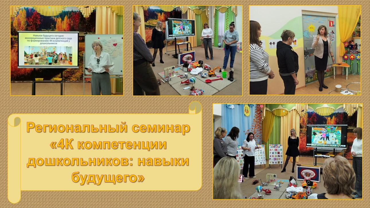 28 ноября в нашем дошкольном учреждении прошел региональный семинар в рамках реализации региональной инновационной площадки "Формирование "4К" компетенций дошкольников средствами развивающих технологий". Фотоотчет о прошедшем семинаре можно посмотреть В ФОТОАЛЬБОМЕ